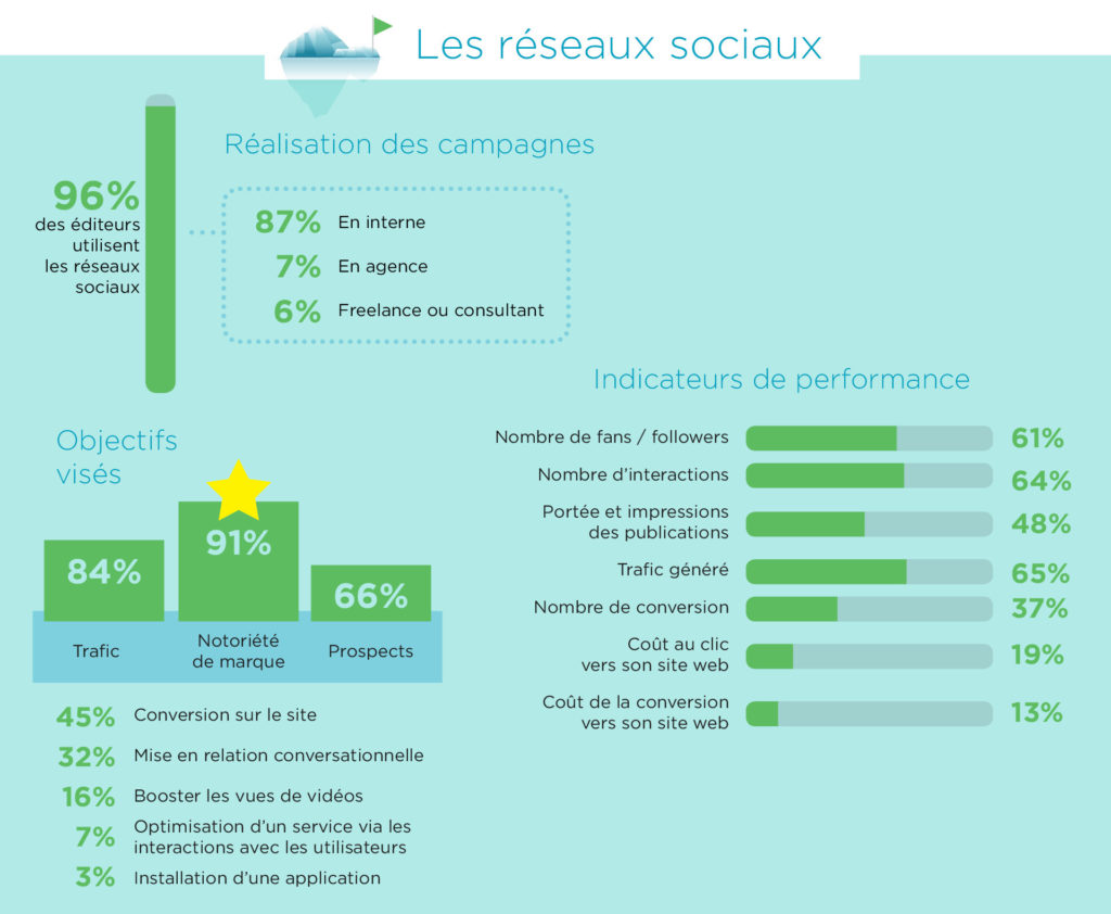 Carrefours conversationnels du web, les réseaux sociaux sont des médias à part entière offrant une audience considérable. Une véritable connaissance tactique de ces leviers et de leur potentiel est indispensable pour obtenir des résultats concrets. En effet, pour 46% des éditeurs, les réseaux sociaux représentent moins de 10% du trafic global de leur site.