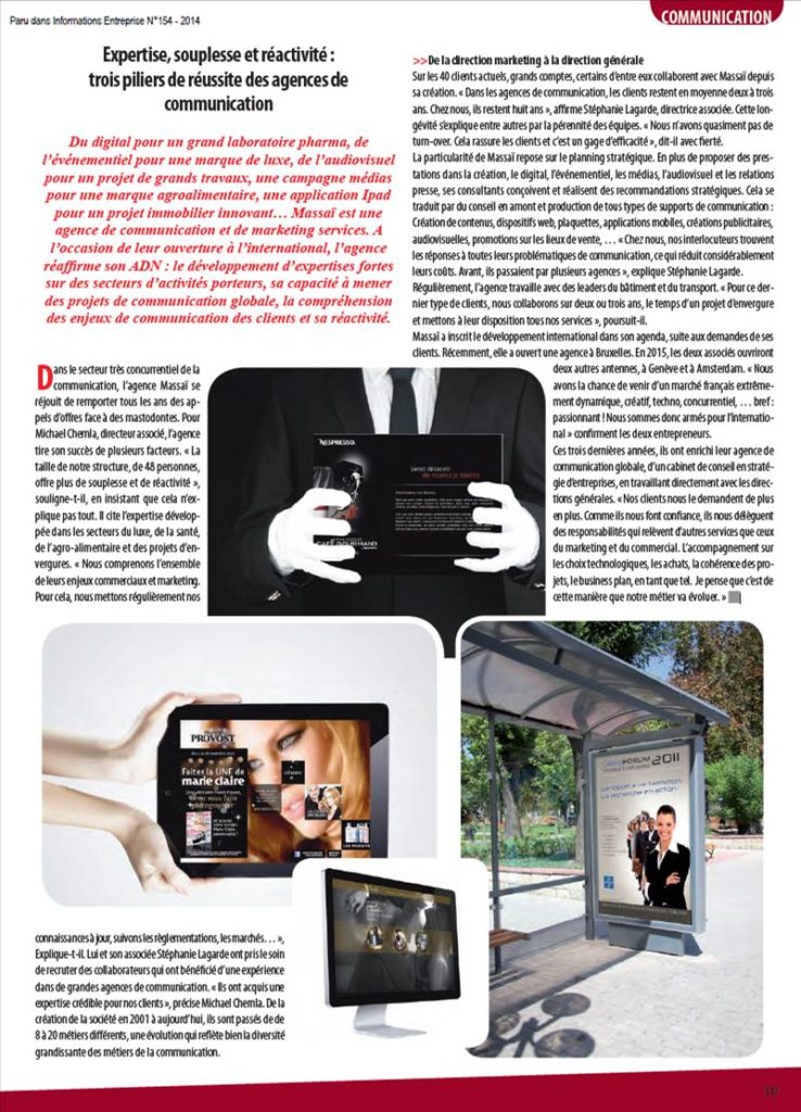 type de clients, nous collaborons sur deux ou trois ans, le temps d’un projet d’envergure et mettons à leur disposition tous nos services », poursuit-il. Massaï a inscrit le développement international dans son agenda, suite aux demandes de ses clients. Récemment, elle a ouvert une agence à Bruxelles. En 2015, les deux associés ouvriront deux autres antennes, à Genève et à Amsterdam. « Nous avons la chance de venir d’un marché français extrêmement dynamique, créatif, techno, concurrentiel, … bref : passionnant ! Nous sommes donc armés pour l’international » confirment les deux entrepreneurs. Ces trois dernières années, ils ont enrichi leur agence de communication globale, d’un cabinet de conseil en stratégie d’entreprises, en travaillant directement avec les directions générales. « Nos clients nous le demandent de plus en plus. Comme ils nous font confiance, ils nous délèguent des responsabilités qui relèvent d’autres services que ceux du marketing et du commercial. L’accompagnement sur les choix technologiques, les achats, la cohérence des projets, le business plan, en tant que tel. Je pense que c’est de cette manière que notre métier va évoluer. »